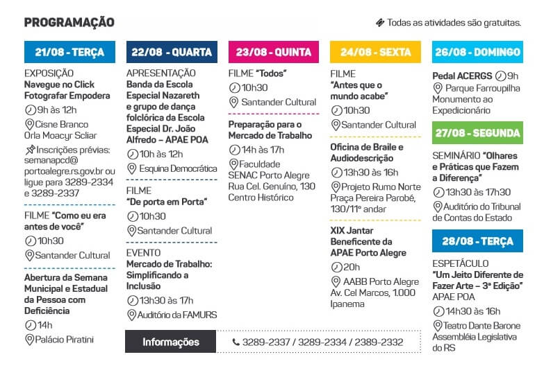 Mais informações e esclarecimentos através do e-mail semanapcd@portoalegre.gov.rs.br ou pelos telefones 3289-2337/2334/2332.